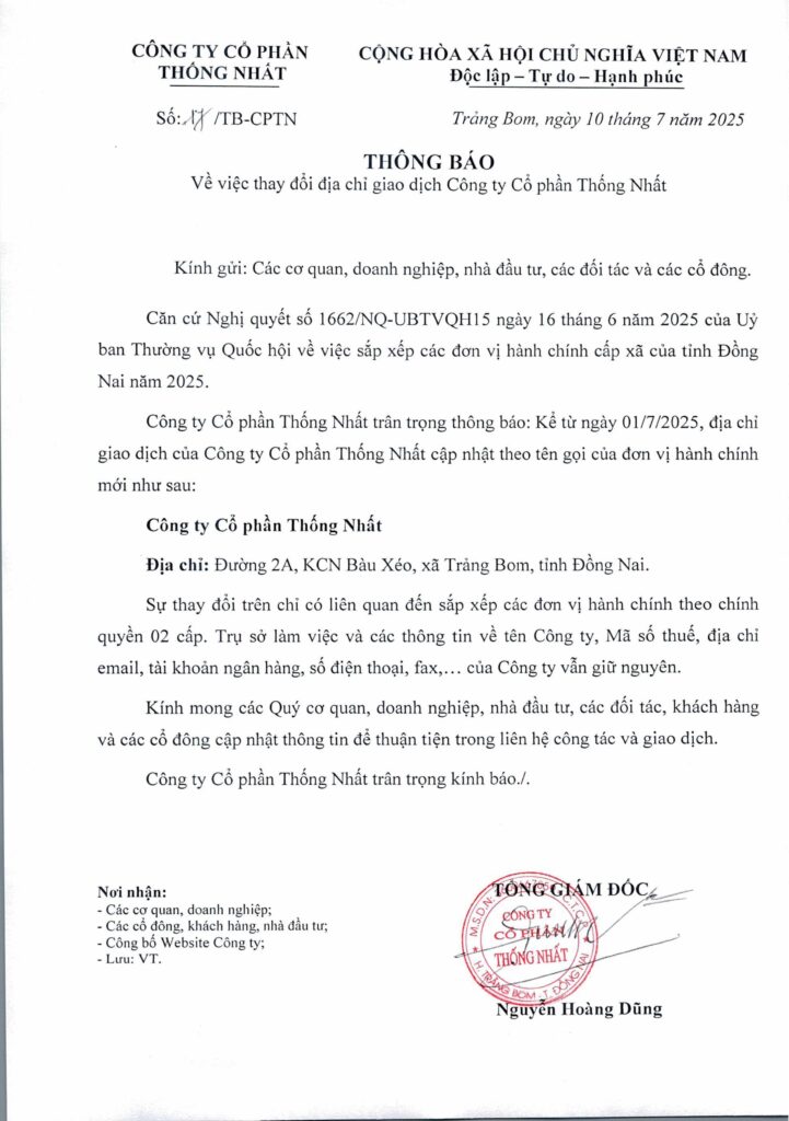 Tin công ty _ 10 Tháng 7, 2025 Thông báo V/v thay đổi địa chỉ giao dịch Công ty Cổ phần Thống Nhất Hoàn thành gần 100 căn nhà ở công nhân Khu Trung tâm dịch vụ KCN Bàu Xéo4 Tháng 12, 2024